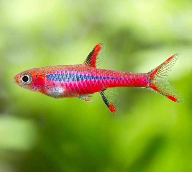 È un ciprinide asiatico timido e appariscente per la colorazione rosso-arancio più accesa nei maschi e di dimensioni ridotte, massimo 2 cm. Indole pacifica e timida, convive con pesci tranquilli e di piccola taglia. Si ciba facilmente con mangimi secchi. Misura M